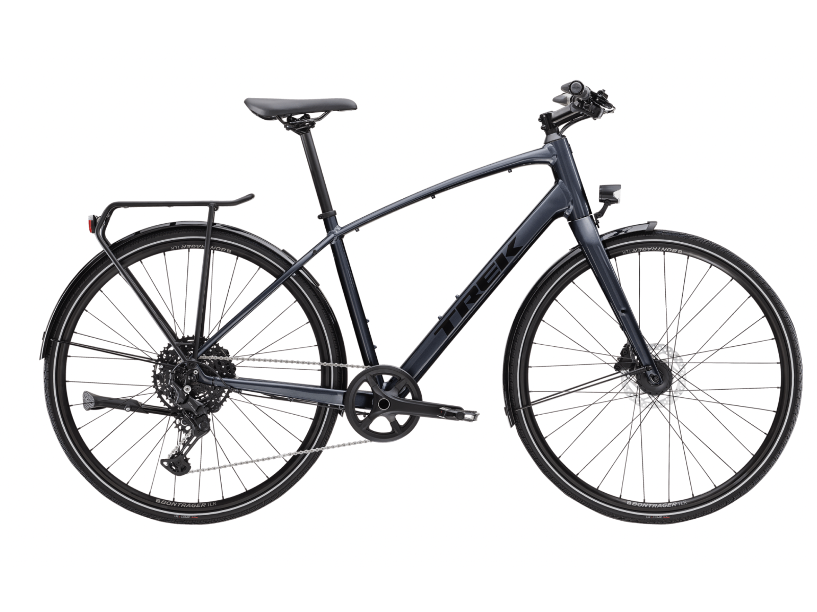 It's right for you if... You find yourself heading out for longer rides more frequently, and want a great-looking bike that's fast, comfortable and fully equipped with the accessories you need on everyday rides. The tech you get A lightweight aluminium frame, a carbon fork, hydraulic disc brakes for all-weather stopping power, and a simple 1x drivetrain that ditches the front derailleur for less clutter and easier operation. Don't worry, the wide-range 11-46 cassette still gives you all the gears you need to conquer hills and crush flats. Plus, it's decked out with front and rear lights, mudguards, a rear rack, puncture-resistant tyres and vibration-absorbing handlebars with ergonomic grips. The final word The FX 3 Equipped is your go-to ride for getting around town and working out. It's smooth, fast and has a simple-yet-capable 1x10 drivetrain. Plus, it comes with pretty much everything but a helmet, so you'll find yourself relying on your bike more for all kinds of trips. Why you'll love it The 1x drivetrain gives you all the gears you need and none you don’t It comes equipped with lights, mudguards and a rear rack so you're ready to ride right from the start It's versatile and does whatever you want it to do, whether that's riding for fitness, commuting or cruising to the farmer's market to do the weekly shop Like every Trek hybrid, it's backed by a lifetime warranty and supported by a wide network of retail partners