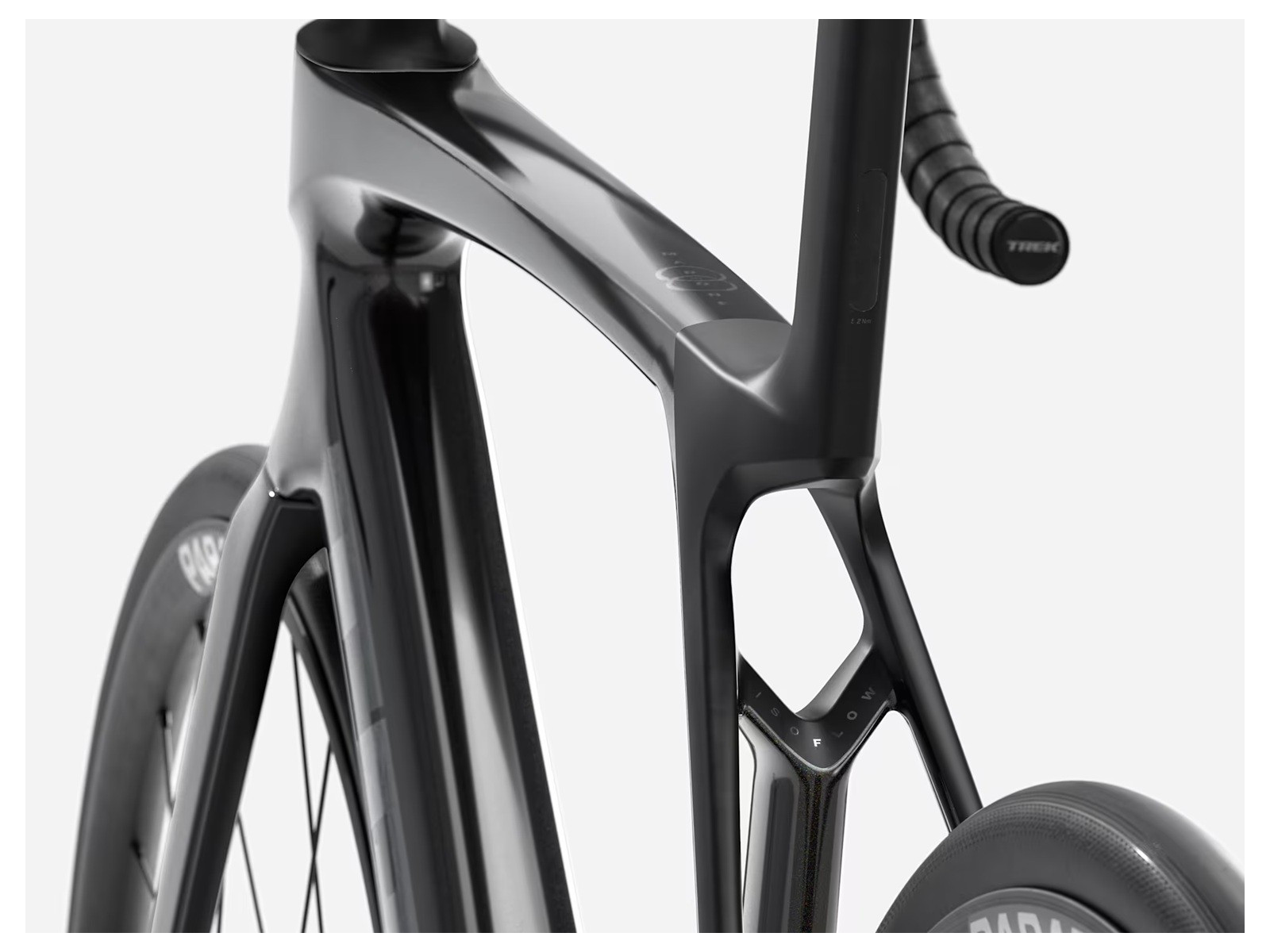 - Madone Gen 8 full carbon, tapered carbon steerer, internal brake routing, flat mount disc, 12x100mm chamfered thru axle